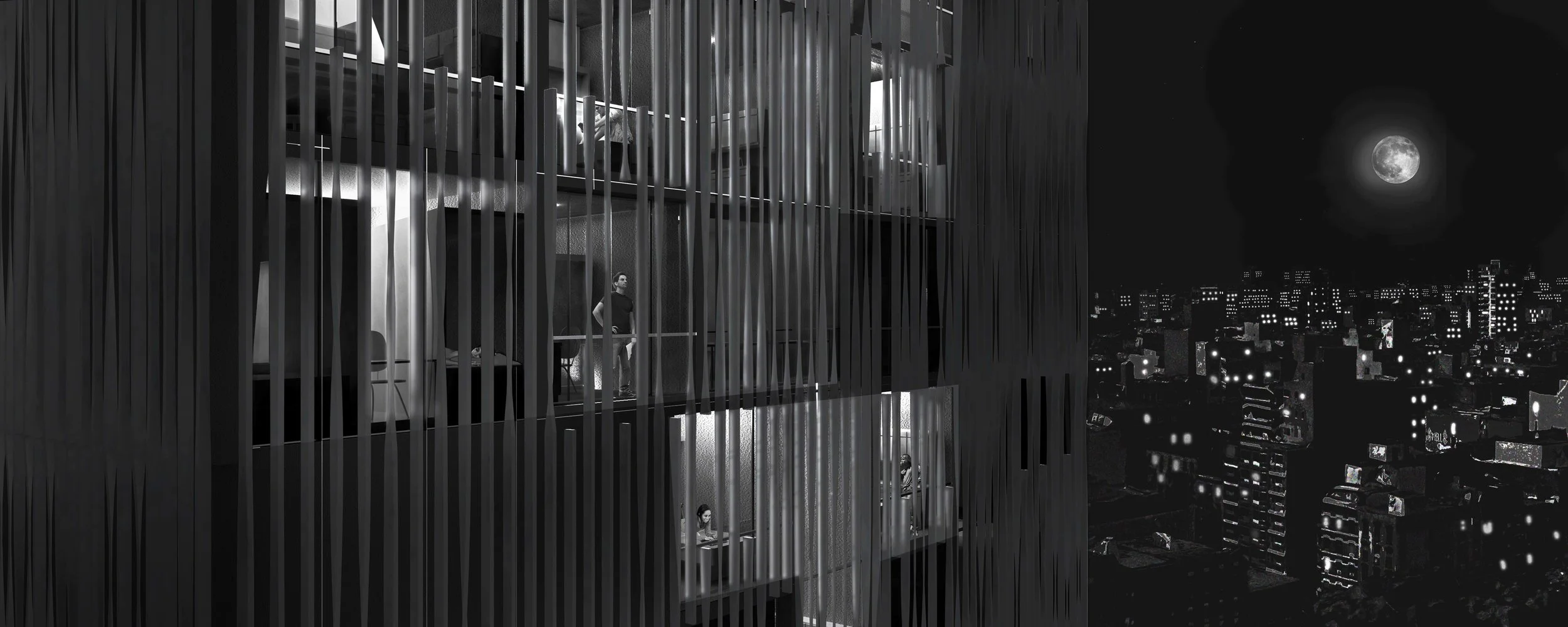 Exterior view of the tower which shows glimpses of the interior activities of individuals inside their alcoves (no balconies) and studio apartments (with balconies)