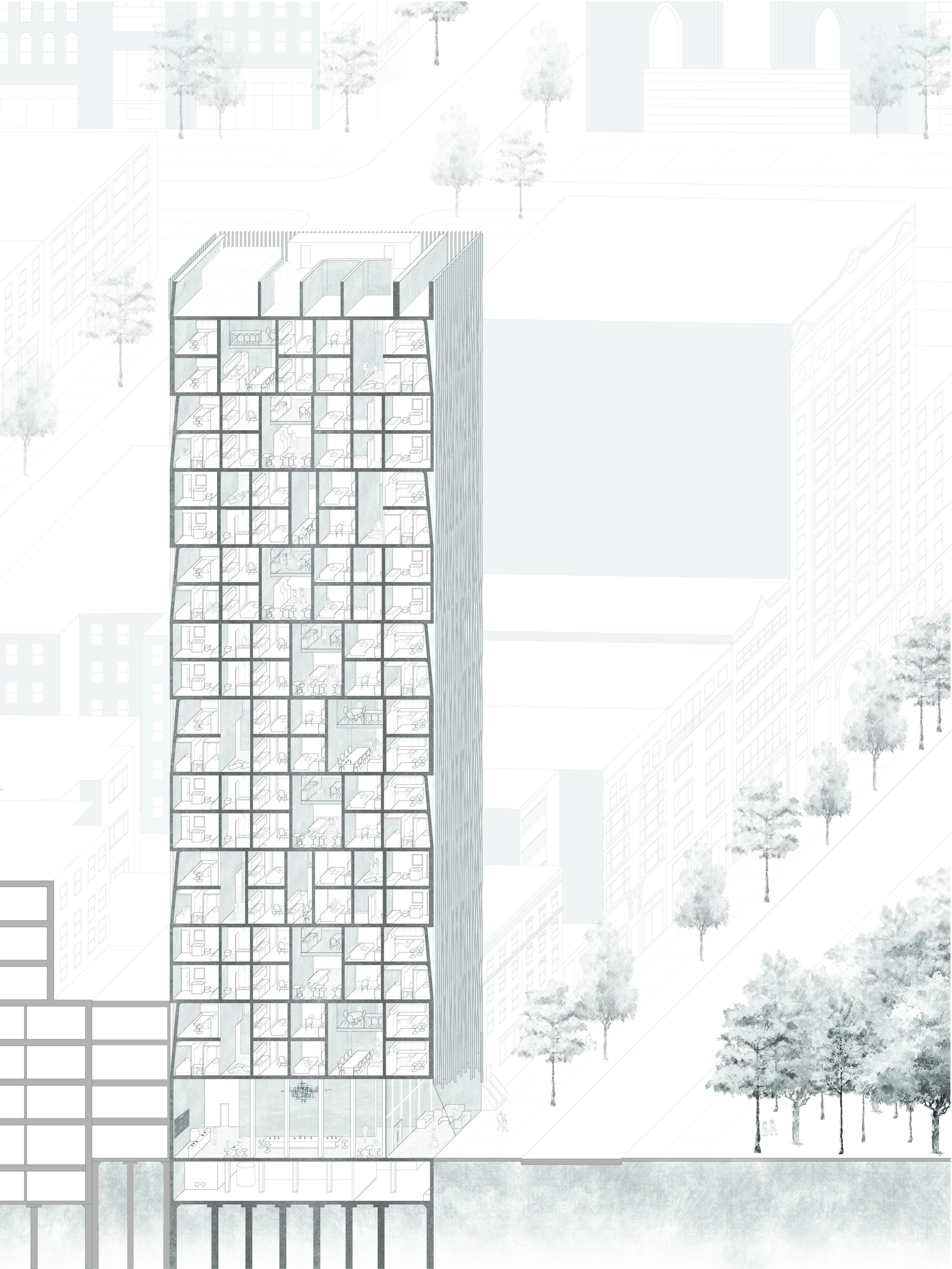As the need and price of housing increases within urban environments, micro-housing has become a prevalent choice for many individuals. Due to this phenomena developers continue to decrease the size of the apartment, sometimes even below law requirements. This micro-housing proposal is a critique of the current condition of housing in New York, and at the same time and intervention which negotiates between the benefit for developers and that of the residents. This new apartment style is 45 sq ft and is able to house 1 individual creating a large revenue for the developer, and leaves enough room within the building for dynamic public spaces which enhance the living condition of the resident.