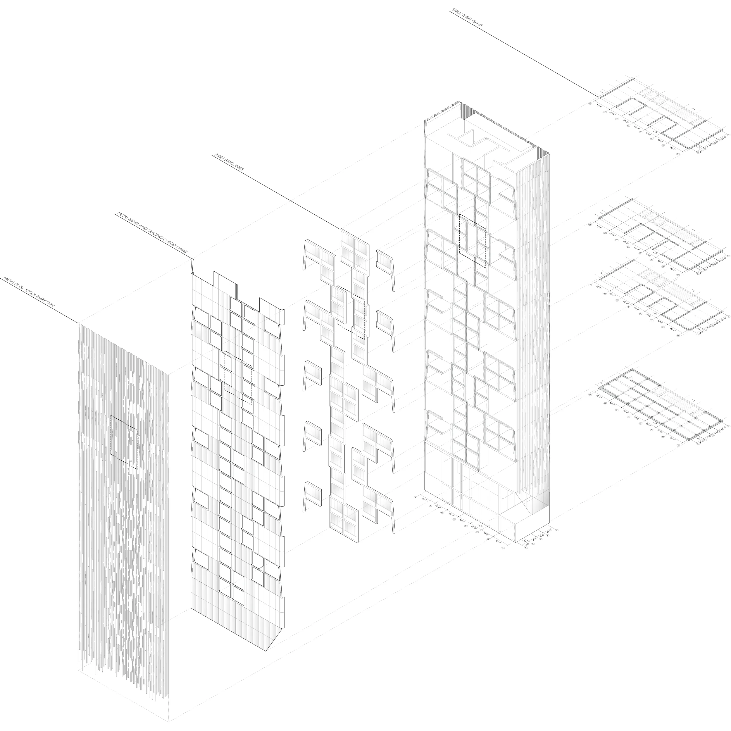 Exploded Axonometric illustrating the assembly of the second skin composed of aluminum fins, a curtain wall of glass and metal panel, balconies, and the structural framing.