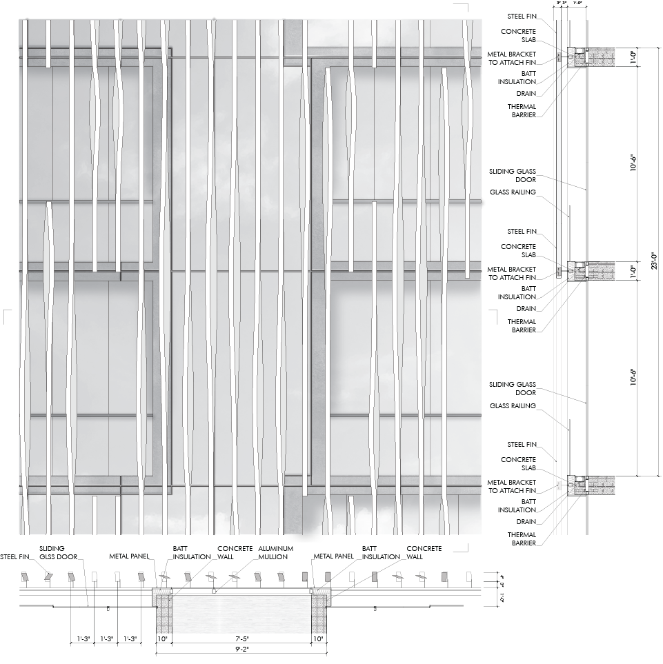 Facade Elevation showing the connection of the exterior skin to the floor plates and curtain wall