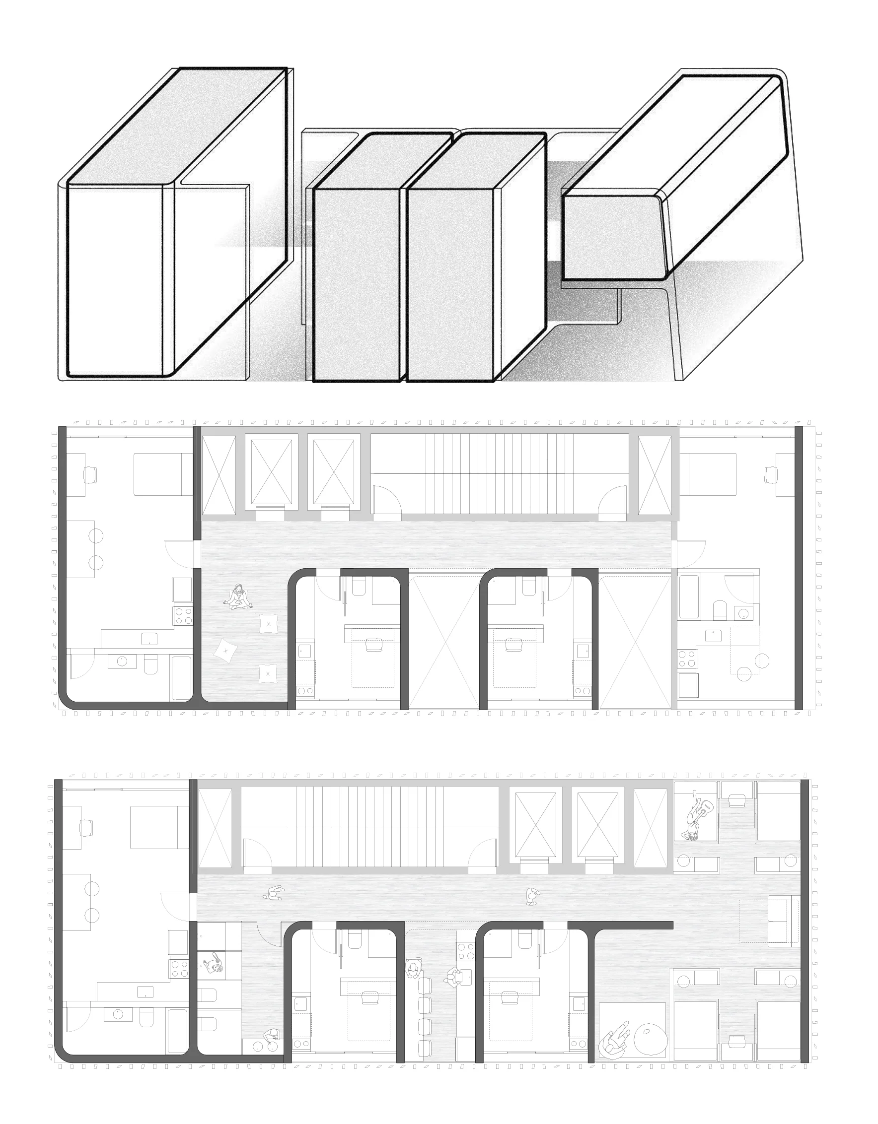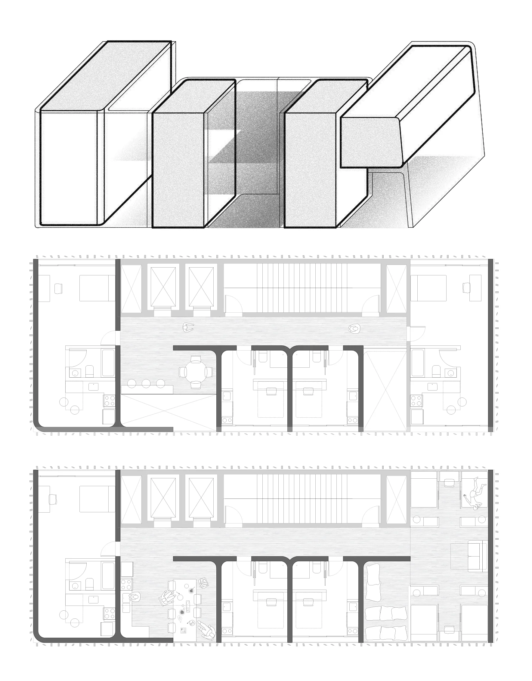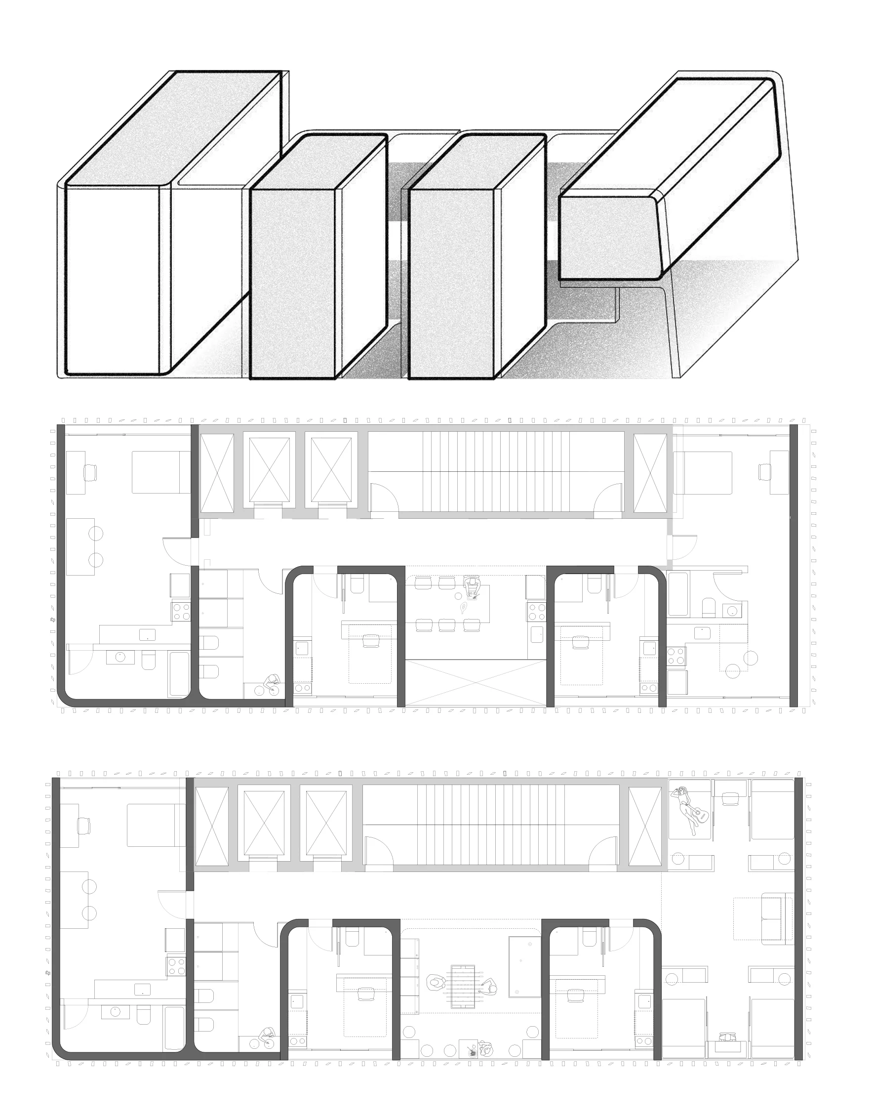 Module 2 - Massing (top), Floor 2 of module (middle), Floor 1 of module (bottom)